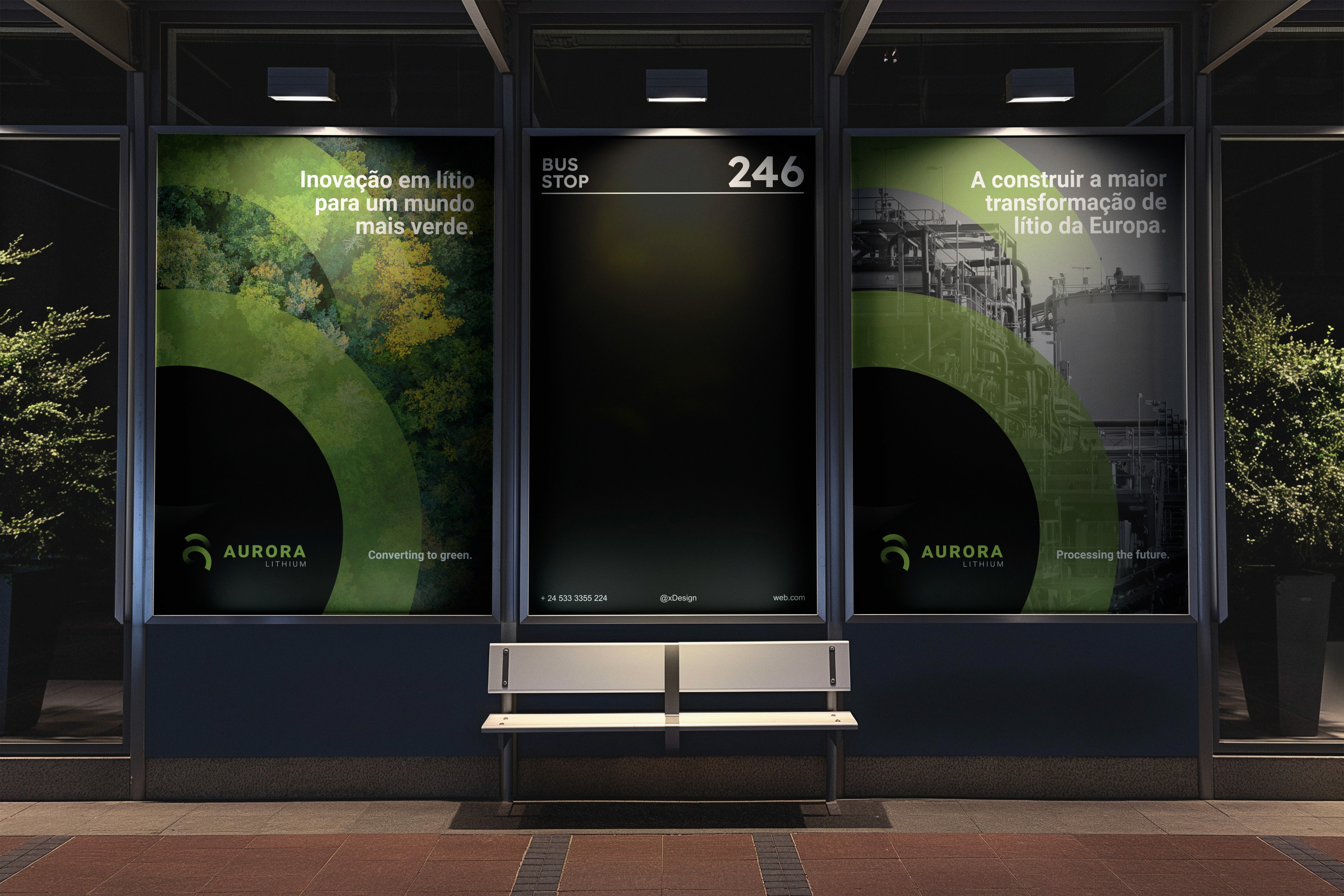 Aurora Lithium’s visual identity translates the convergence between industry and nature, technology and sustainability, the core pillars of its positioning. Through a graphic language based on circular and fluid shapes, inspired by the continuous cycle of resources and energy, the brand expresses transformation: from raw lithium to the power that drives the future. This visual element builds consistency and recognition, while also conveying movement, agility, and innovation. The contrast between industrial and natural imagery reinforces Aurora Lithium’s unique proposition: a highly technological operation that works in balance with the environment. The green color palette, combined with black, communicates sustainability, sophistication, and industrial strength.